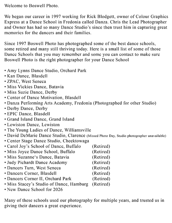 At Boswell Photo, we specialize in bringing the elegance and energy of dance to life through stunning photography. From dynamic studio portraits to expressive outdoor sessions and vibrant local dance school coverage, we capture every leap, twirl, and emotion. Based in Buffalo, New York, we are dedicated to creating beautiful memories that last a lifetime.